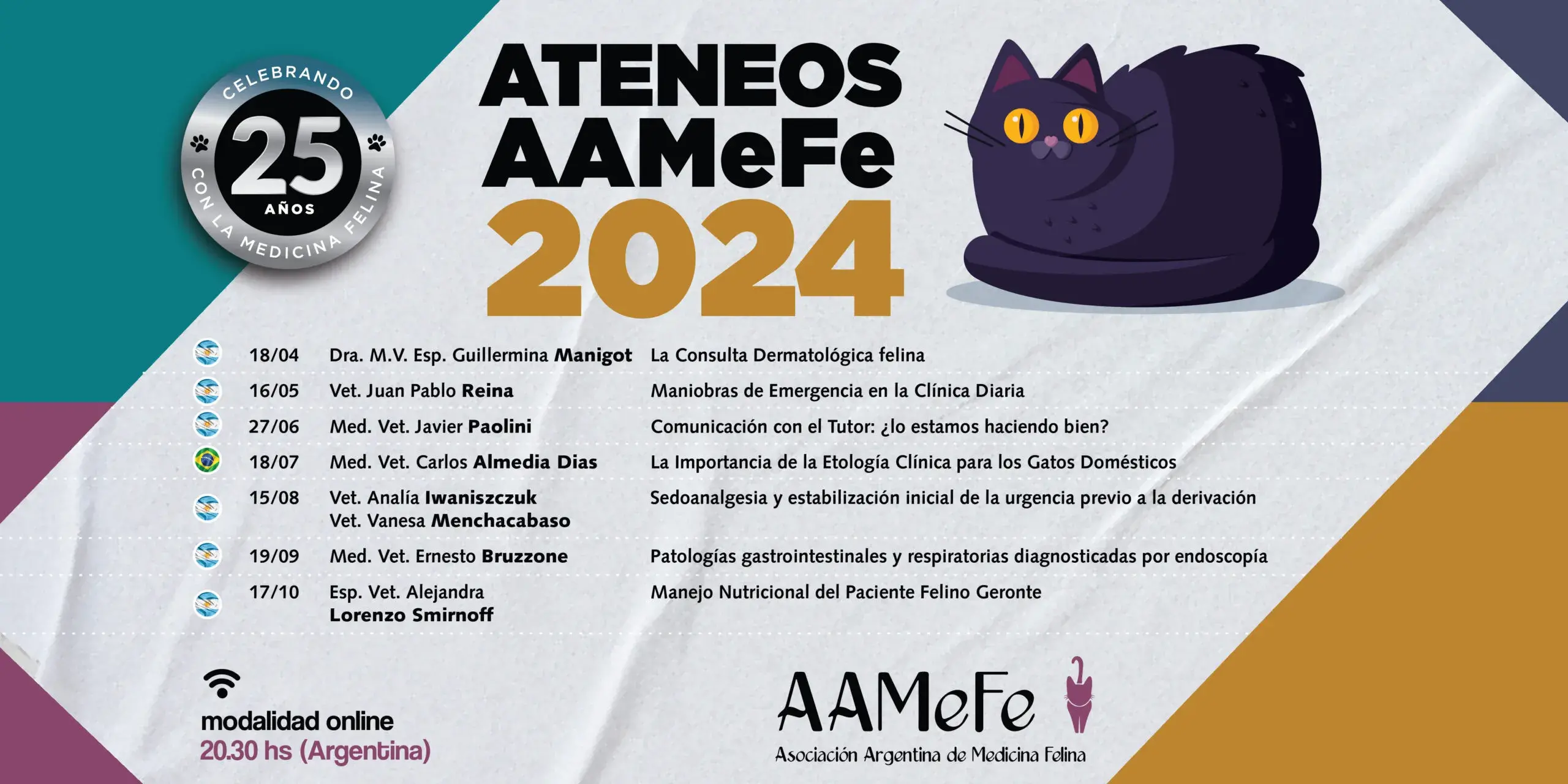 Estamos muy felices de presentarles nuestro calendario de ateneos AAMeFe 2024, como siempre con excelentísimos disertantes y temas de sumo interés en Medicina Felina.