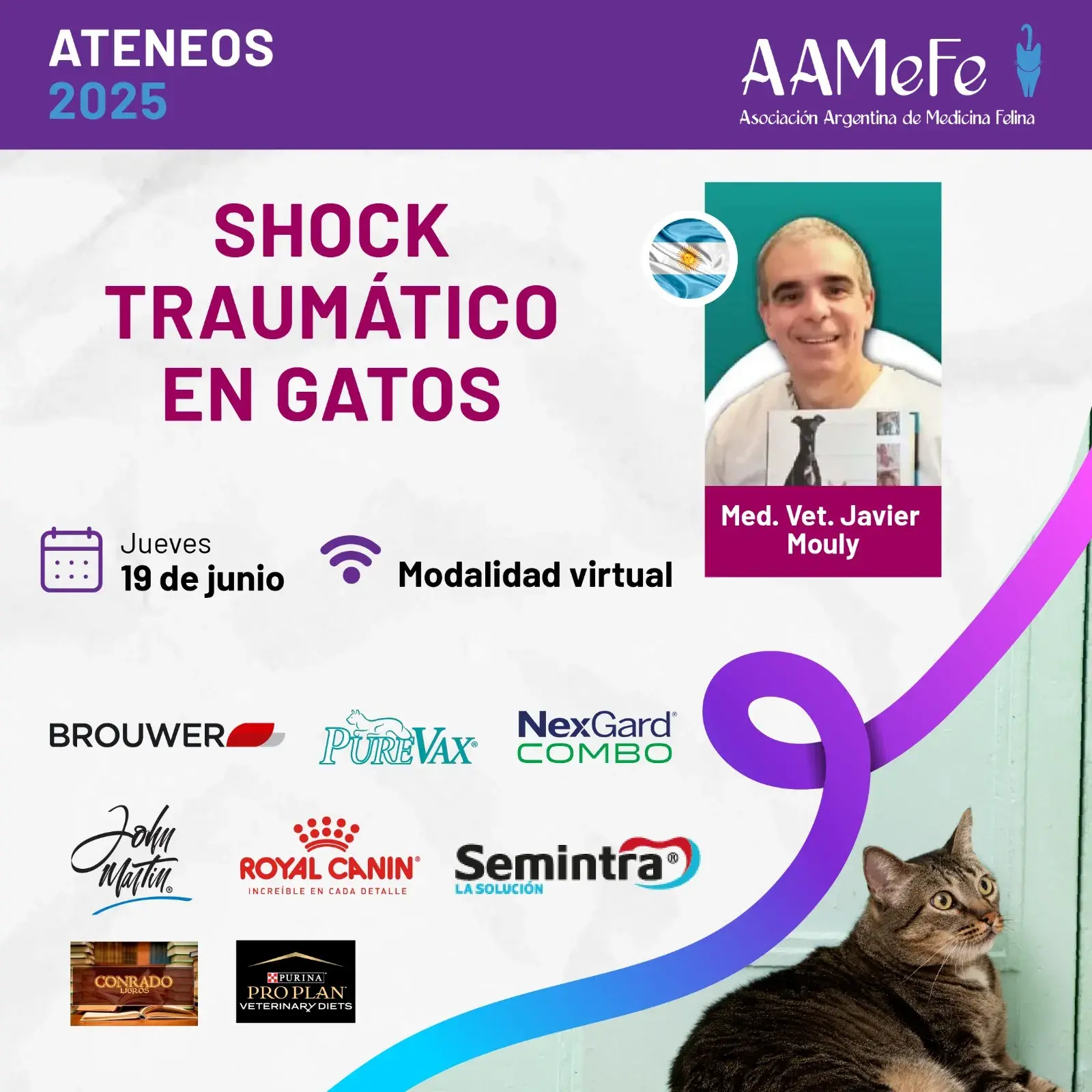 Los invitamos a nuestro próximo ateneo, titulado Shock traumático en gatos, donde se abordará en profundidad los aspectos clínicos y fisiopatológicos más relevantes de esta condición crítica en la especie felina. Estará a cargo del Dr. Javier Mouly.